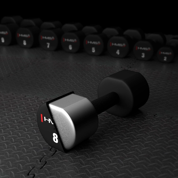 Czarna, matowa powłoka poliuretanowa nadaje hantlom HPT08 elegancki, nowoczesny wygląd, który wpasuje się zarówno w profesjonalną siłownię, jak i domową strefę fitness. Wyraźne oznaczenia wagowe na obu końcach hantli umożliwiają szybki wybór odpowiedniego obciążenia, co znacznie usprawnia przebieg treningu, zwłaszcza gdy korzysta z nich kilka osób.