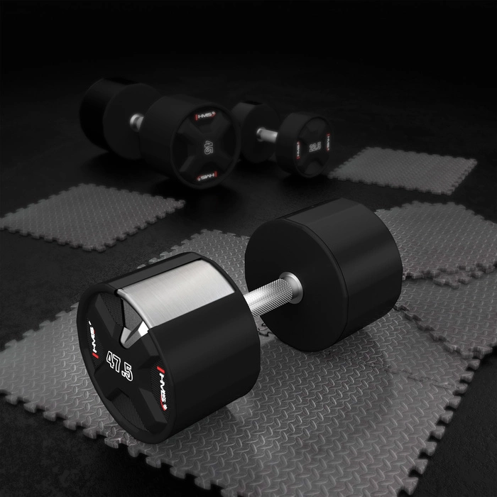 Zestaw HPC zachwyca nowoczesnym wyglądem, który doskonale wpisuje się w estetykę zarówno profesjonalnych siłowni, jak i domowych sal treningowych. Elegancka linia, precyzyjne wykończenie oraz subtelne oznaczenia wag sprawiają, że hantle prezentują się wyjątkowo stylowo na stojaku czy podłodze.