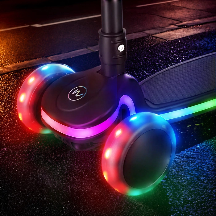 Efektowne kółka LED, które świecą w czasie jazdy, dodając frajdy i zwiększając bezpieczeństwo dziecka w warunkach słabszego oświetlenia.