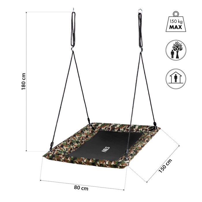 Dzięki prostokątnemu siedzisku o wymiarach 150 × 80 cm, huśtawka NB5043 oferuje więcej przestrzeni użytkowej niż tradycyjne, okrągłe modele. Taki kształt umożliwia zarówno wygodne siedzenie, jak i leżenie, a także korzystanie z huśtawki przez dwie osoby jednocześnie. To idealne rozwiązanie dla rodzeństwa lub rodzica z dzieckiem.