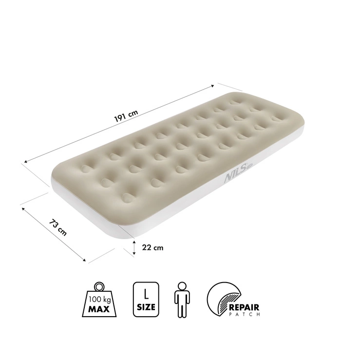 NC2801 został zaprojektowany z myślą o łatwym transporcie i przechowywaniu. Po spuszczeniu powietrza składa się do kompaktowych rozmiarów, dzięki czemu bez problemu zmieści się w plecaku, szafie czy bagażniku. Jego jednoosobowa konstrukcja idealnie sprawdzi się podczas samodzielnych podróży, campingów, noclegów u znajomych czy jako dodatkowe łóżko dla gościa.