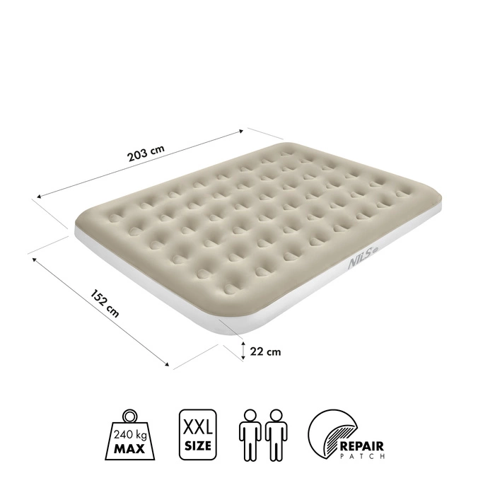 Z imponującymi wymiarami 191 × 152 × 22 cm, materac oferuje jeszcze więcej przestrzeni niż standardowe modele dwuosobowe. Szerokość 152 cm pozwala na swobodny sen dla dwóch osób, bez ograniczeń ruchu i nieprzyjemnego ścisku. Z kolei wysokość 22 cm skutecznie izoluje ciało od podłoża, co ma ogromne znaczenie zwłaszcza podczas wypoczynku na nierównej lub chłodnej nawierzchni.