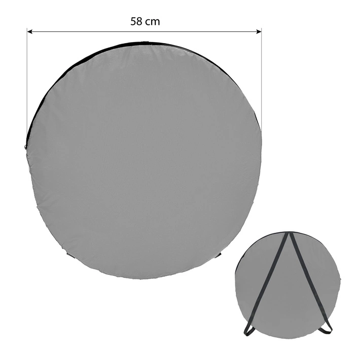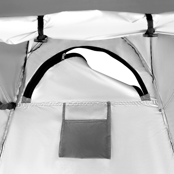 Zewnętrzna powłoka wykonana została z wytrzymałego, wodoodpornego poliestru, który chroni przed deszczem i wilgocią. Od wewnątrz zastosowano srebrną warstwę termoizolacyjną, która zapobiega nagrzewaniu się wnętrza, nawet podczas upałów. Materiał jest w pełni kryjący i nieprześwitujący, dzięki czemu korzystanie z przebieralni gwarantuje komfort i dyskrecję niezależnie od warunków zewnętrznych.