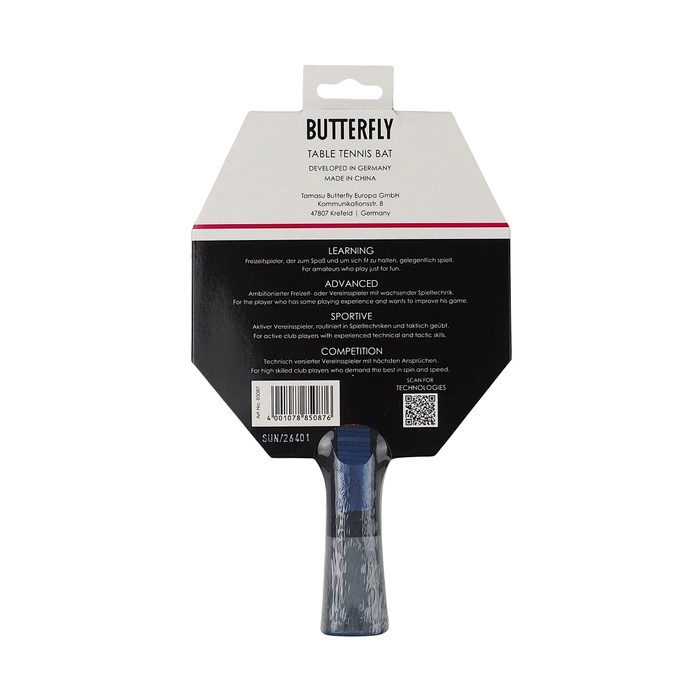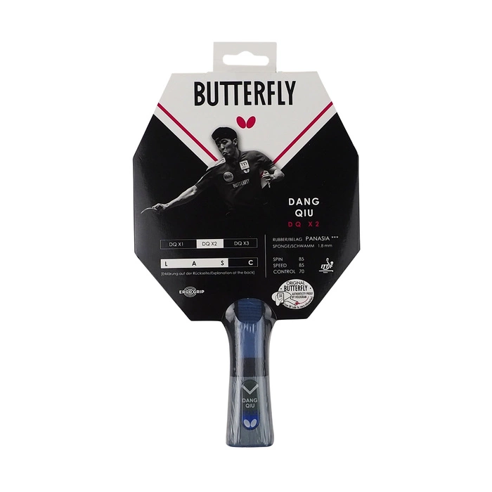 Rakietka do tenisa stołowego Butterfly polecana jest dla średnio-zaawansowanych zawodników, którzy doskonalą technikę. Konstrukcja z okładziną Panasia i podkładem o grubości 1,8 milimetra zapewnia długą żywotność. Technologia Ergo Grip czyli ergonomiczny kształt rączki pewnie układa się w dłoni umożliwiając maksymalne przeniesienie siły uderzenia. Kod QR w dolnej części rączki zawierający informacje o marce, graczach i asortymencie jest dowodem autentyczności rakietki.