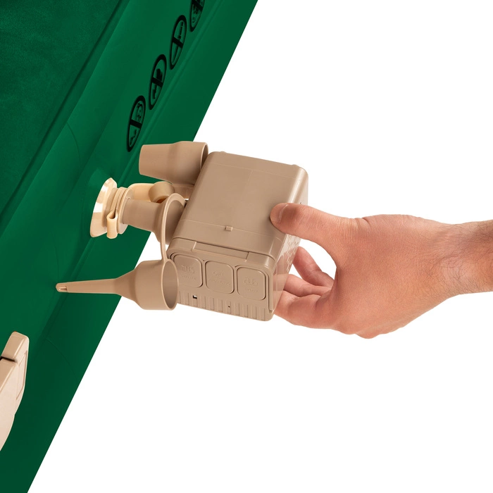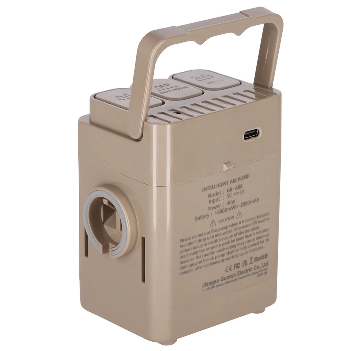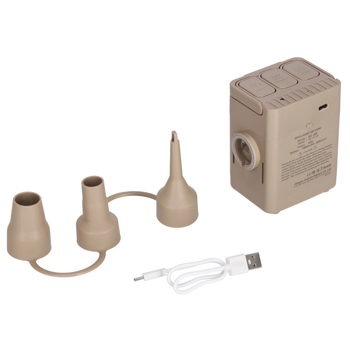 Beżowa pompka o mocy 40 W wyposażona została w trzy wymienne końcówki, które pasują do różnych typów zaworów. Dzięki temu może być wykorzystywana nie tylko do nadmuchiwania materaca, ale także innych akcesoriów – jak pontony, koła ratunkowe, baseny ogrodowe czy inne nadmuchiwane produkty.