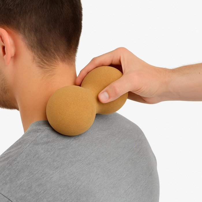 Wybierz podwójną piłeczkę do masażu korkową ENERO FIT, idealną do terapii punktów spustowych wzdłuż kręgosłupa, karku, nóg i łydek.