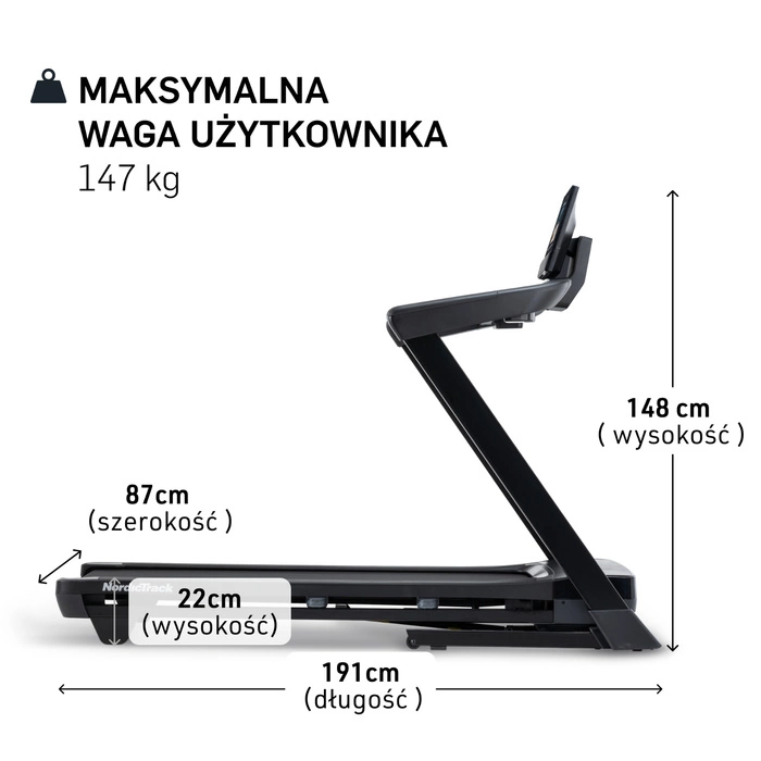Wymiary bieżni: 191 x 87 x 148 cm (dł. x szer. x wys.)