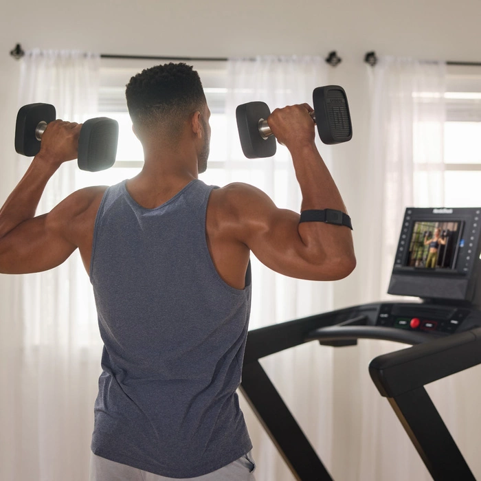 iFIT śledzi Twoje postępy i automatycznie dostosowuje nachylenie bieżni w zakresie od 0 do 10% oraz prędkość od 0 do 16 km/h, zapewniając trening bez konieczności manualnej regulacji. Jeśli używasz czujnika tętna z technologią Bluetooth®, funkcja ActivePulse™ automatycznie zmieni intensywność treningu, aby utrzymać Cię w optymalnej strefie tętna.