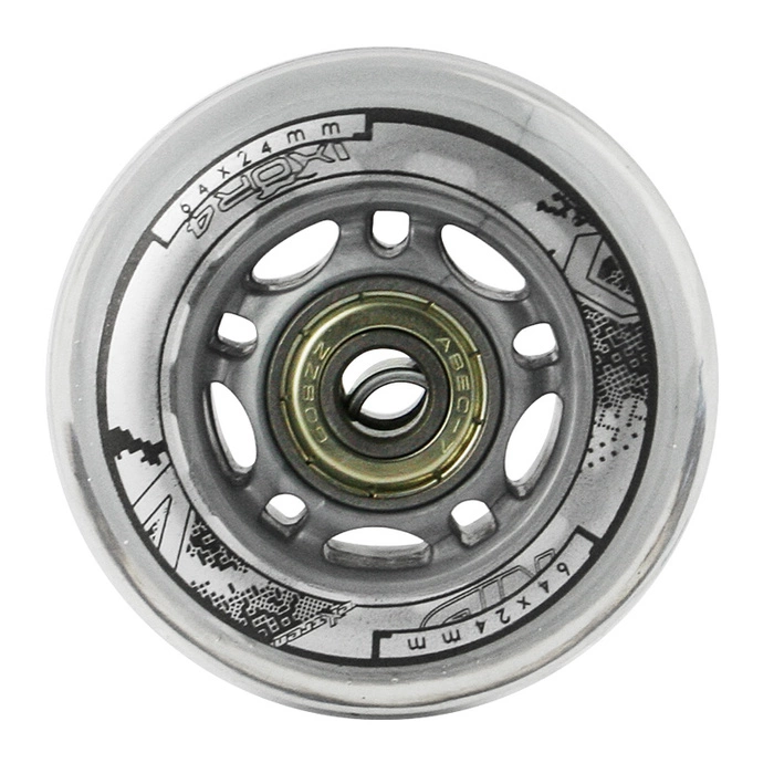 PU 64x24 82A PRZEZROCZYSTE (4 szt.) + ABEC-7 (8 szt.) to zestaw 4 kółek i 8 łożysk marki Nils Extreme. Kółka występują w rozmiarach 64x24, 70x24, 72x24, 76x24, 80x24. Są dostępne w dwóch wersjach kolorystycznych: białej i przezroczystej.
