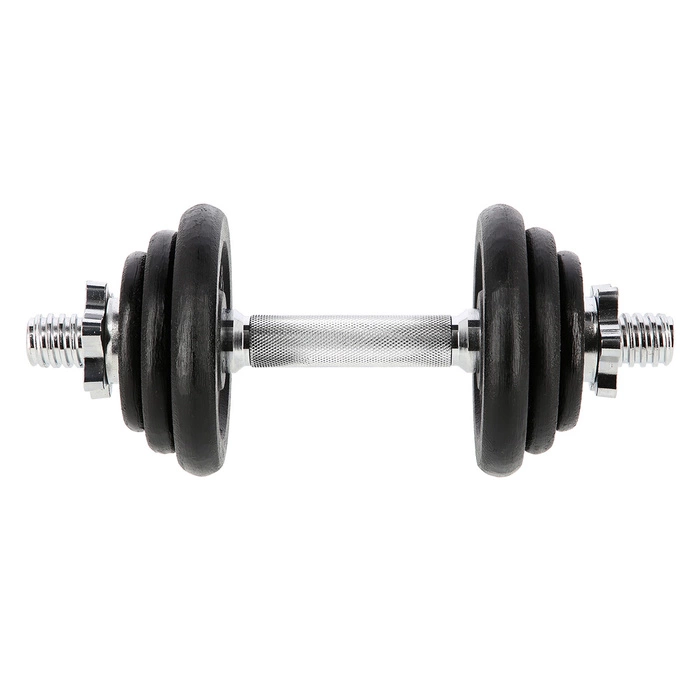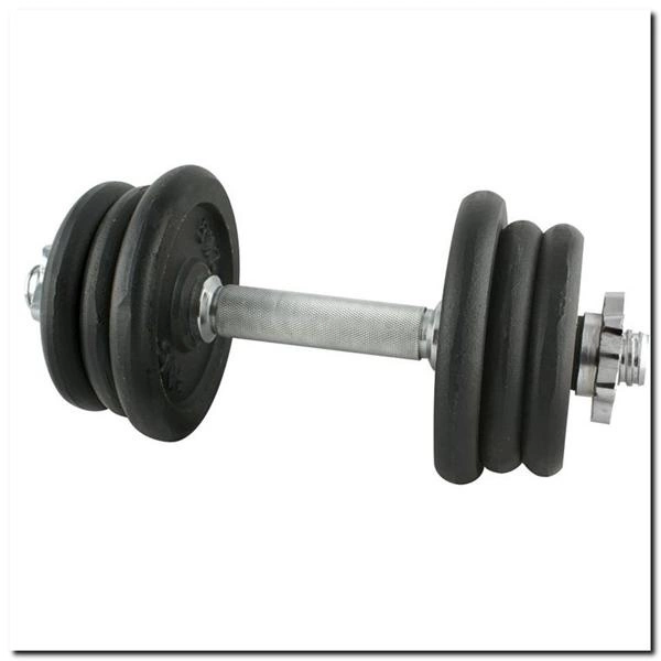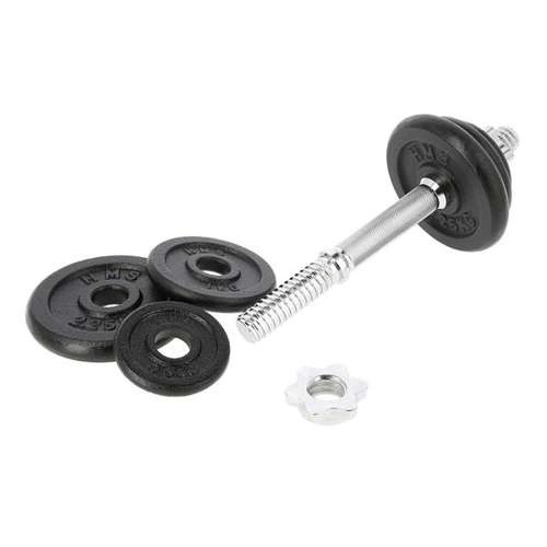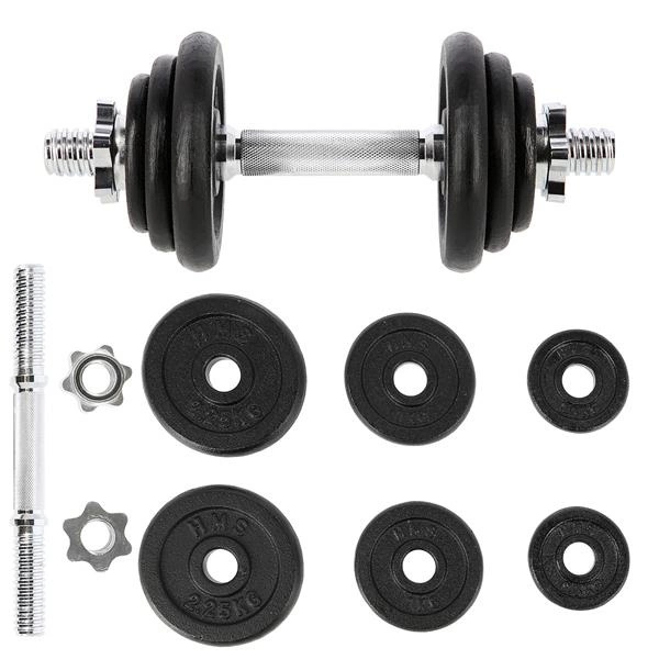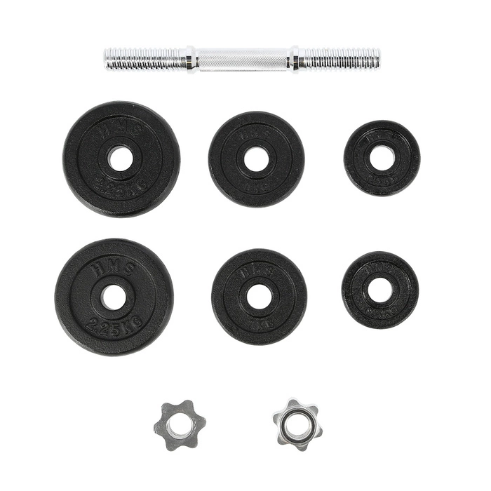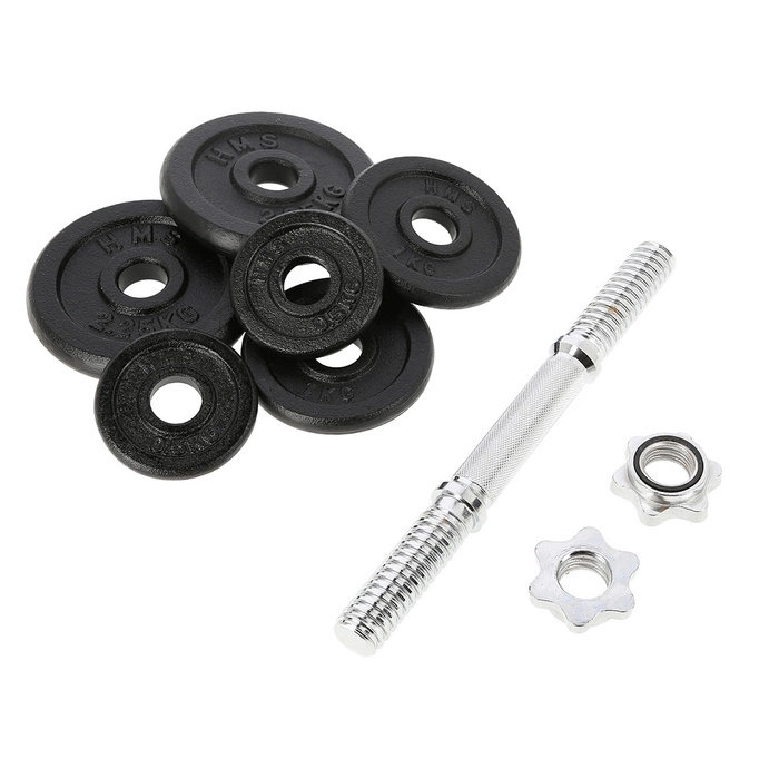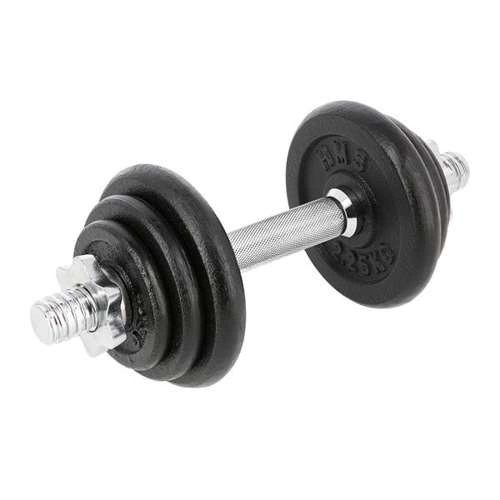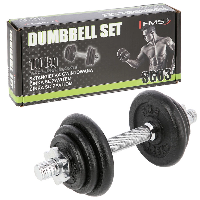 Sztangielka z gwintem 10 KG HMS SG03 z pewnością przyda się w każdej domowej siłowni. Dostępna jest w postaci zestawu składającego się z: gryfu prostego 2kg, 2 talerzy 0,5 kg, 2 talerzy 1 kg, 2 talerzy 2,25 kg oraz 2 zacisków gwiazdowych 0,25 kg. Gryf wykonany jest z wysokiej jakości stali niklowanej, zaś talerze są żeliwne. Gryf posiada ryflowany uchwyt, dzięki czemu nie wyślizguję się w trakcie ćwiczeń i wygodnie układa się w dłoniach.
