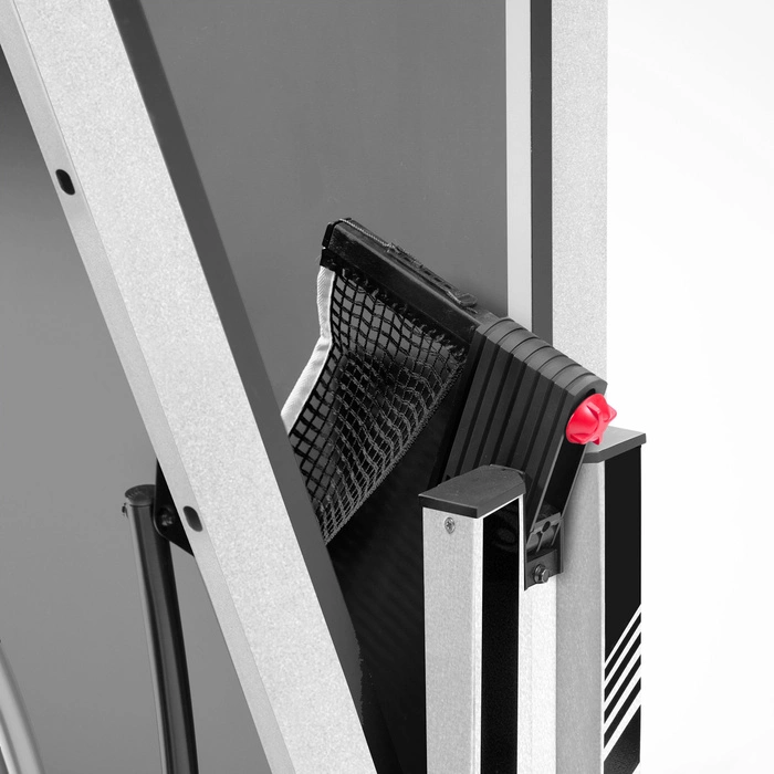 Siatka przy zamykaniu stołu automatycznie chowa się pomiędzy blatami, co zapewnia zmniejszenie zajmowanego miejsca i bezpieczeństwo.