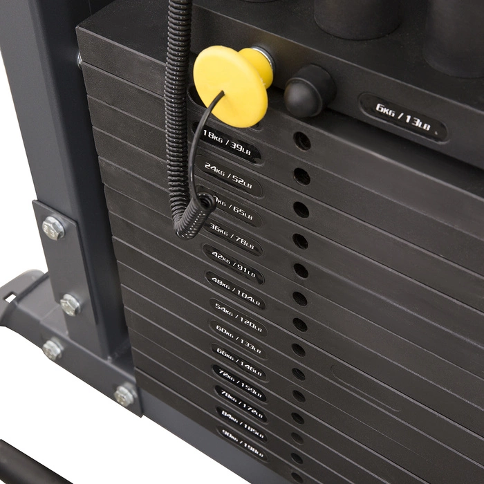 Urządzenie wyposażone jest w dwa stosy obciążeniowe po 90 kg każdy, z precyzyjną regulacją co 6 kg. Takie rozwiązanie pozwala na dostosowanie intensywności treningu do własnych możliwości oraz stopniowe zwiększanie obciążenia w miarę postępów. Niezależne stosy umożliwiają także jednoczesny trening dwóch osób lub wykonywanie ćwiczeń bilateralnych, co znacząco zwiększa funkcjonalność urządzenia.