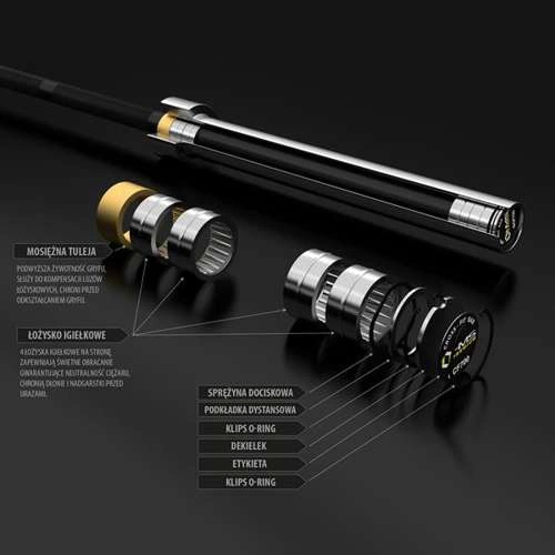 Staranne radełkowanie uchwytów zapewnia pewny chwyt, a chromowana powierzchnia zapobiega korozji przez długi czas. Część chwytna o średnicy 28 mm gwarantuje duży komfort ćwiczeń. Łożyska igiełkowe pozwalają na płynne obracanie się obciążników.