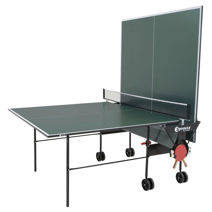 Produkt stół do tenisa SPONETA S1-12i charakteryzuje się wysoką jakością: ma proszkowano malowaną ramę i blat z powlekanej wielokrotnie płyty wiórowej. Jego zielony kolor to najbardziej standardowy wariant, który pasuje do każdego klubu sportowego czy sali ćwiczeń. Możliwość rozłożenia tylko połowy stołu pozwala również ćwiczyć samemu.