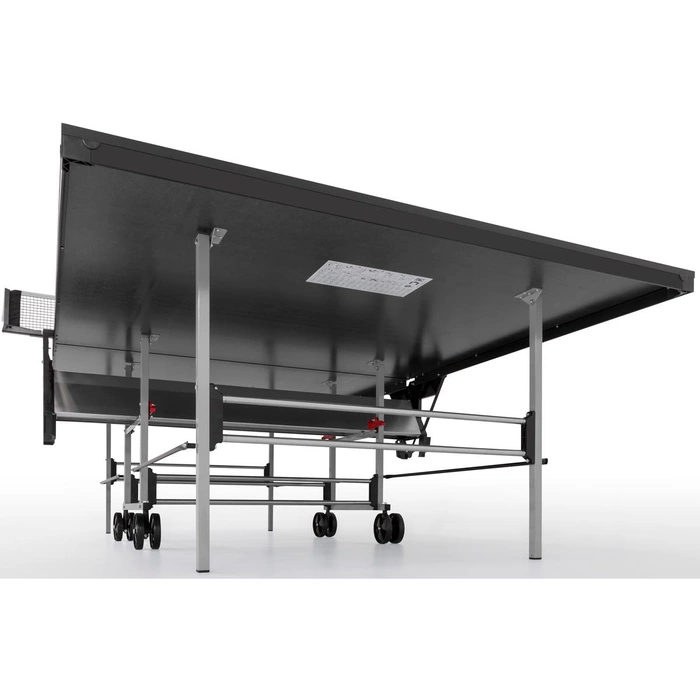 Jego wymiary są standardowe i typowe dla tego rodzaju sprzętu. Produkt można złożyć, dzięki czemu nie będzie on zajmował zbyt dużo miejsca po skończonych rozgrywkach i będzie go można z łatwością schować. Warunek który pozwoli utrzymać sprzęt w pierwotnym stanie przez długi czas, to konieczność używania stołu wyłącznie w zamkniętych pomieszczeniach, ponieważ jest on nieodporny na działanie czynników zewnętrznych, przez co mógłby ulec trwałemu uszkodzeniu. Waga sprzętu wynosi 76,5 kg. Stół został wyprodukowany z niezwykłą starannością i dbałością o każdy detal. Blat wykonany jest z 19 mm płyty wiórowej, wielokrotnie powlekanej. Profil ramy w kolorze czarnym L-36 mm jest powlekany proszkowo, podobnie jak poszczególne elementy podstawy. Stelaż to w istocie kwadratowe profile 25x25 mm w kolorze szarym. Do stelaża przytwierdzone są 4 podwójne, skrętne koła o średnicy 125 mm, które ułatwiają transportowanie stołu. Całość prezentuje się bardzo profesjonalnie, a co ważne konstrukcja jest w pełni odporna na uszkodzenia mechaniczne i zarysowania.