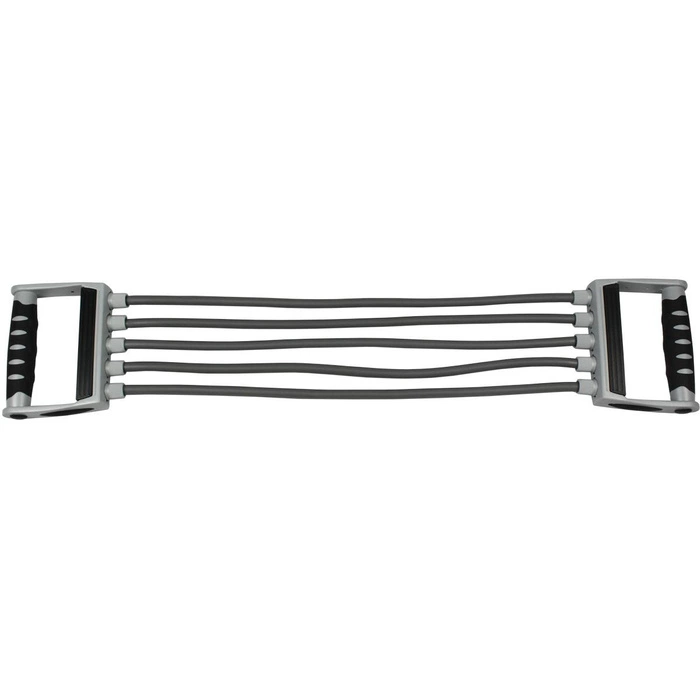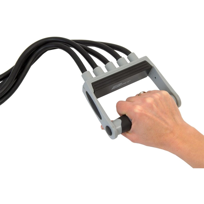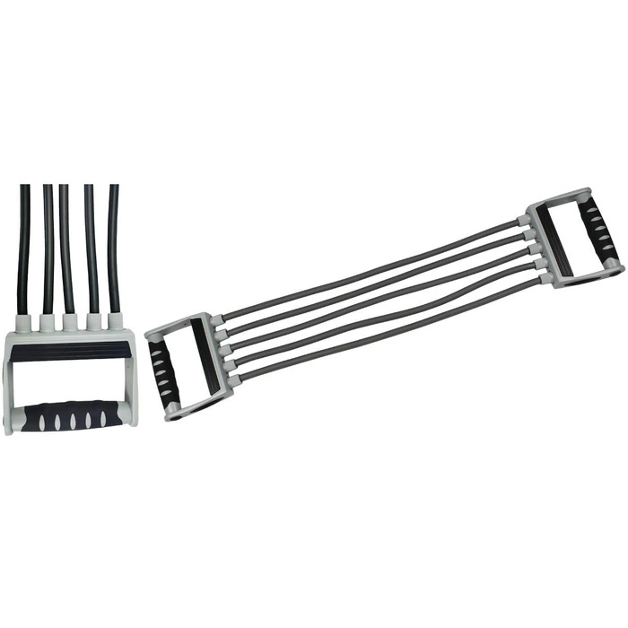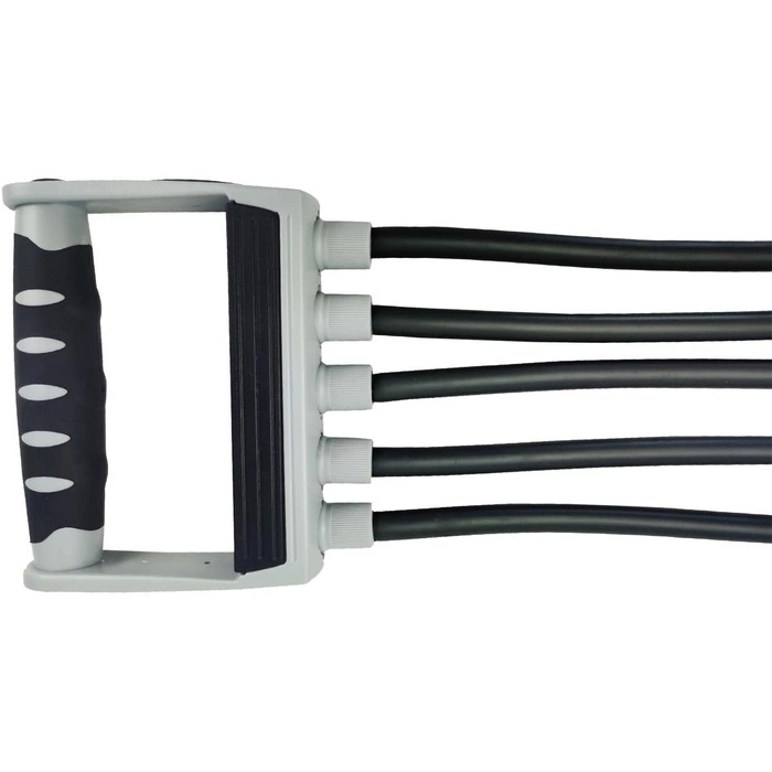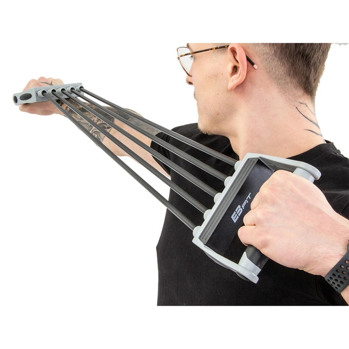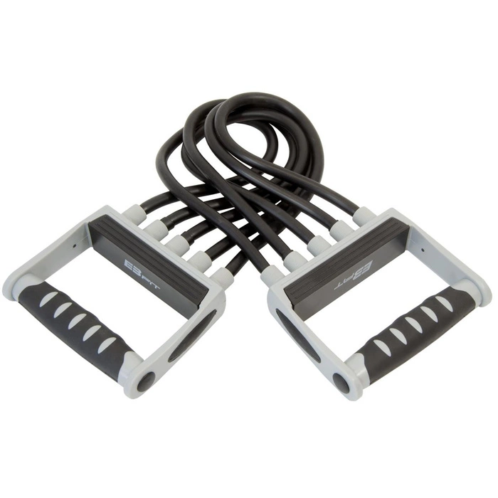 EKSPANDER GUMOWY EB FIT 5 LINEK - Ekspander to funkcjonalny, poręczny przyrząd, który umożliwia wykonywanie podstawowych ćwiczeń rozwijających mięśnie pleców, barków oraz klatki piersiowej, może służyć również do rozbudowania innych partii mięśni takich jak uda, biceps, triceps. Przyrząd składa się z pięciu gum z materiału TPR; w zależności od potrzeb linki można dodawać lub odejmować i w ten sposób - regulować poziom oporu. Wygodne, plastikowe uchwyty dobrze leżą w dłoni i nie wyślizgują się podczas ćwiczeń.