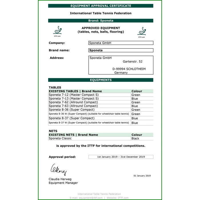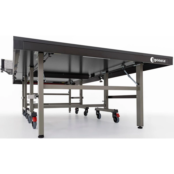 Stół do tenisa stołowego Sponeta S7-12I i S7-13I Master Compact jest przeznaczony dla zawodników, którzy posiedli już bardzo duże umiejętności gry w tenisa stołowego i używa się go do gry podczas turniejów tenisa stołowego. Idealnie nadaje się do profesjonalnego treningu, gdyż nawet w przypadku braku partnera, zajęcia można z powodzeniem przeprowadzić, ponieważ stół posiada funkcję złożenia, aby trenować mogła jedna osoba. Stół jest wykonany według oficjalnych, światowych parametrów, a więc jego długość to 274 cmszerokość 152,5 cm, natomiast wysokość 76 cmWaga stołu do gry wynosi brutto 122 kg, netto 111 kg. Blat jest wykonany z płyty wiórowej o grubości 25 mm w kolorze zielonym. Profil ramy L-60 mm jest powlekany proszkowo, a rama jest wykonana w kolorze czarnym.