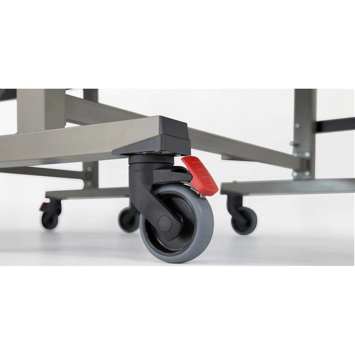 4 skrętne koła o średnicy 100 mm z bieżnikiem gumowym na każdym blacie, 2 z blokadą