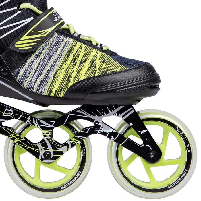 Płoza łyżworolki jest aluminiowa, jednoczęściowa CNC o wymiarze 3,4 mm, co ma zapewnić wytrzymałość, stabilność i dokładność ruchów podczas jazdy, szczególnie przy pokonywaniu slalomów. Materiał skorupy to PP wzmocnione włóknem szklanym i nylonem z łożyskiem ABEC9. Kółka to PU110mm/82 A.