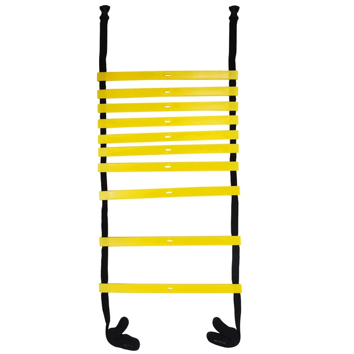 Drabinka treningowa model AGF-FF04M sprawdza się zarówno w czasie treningu na zewnątrz, jak i w pomieszczeniach. Drabinka jest wykonana ze szczebli (10 szt.) z trwałego PCV. Intensywny żółty kolor zapewnia dobrą widoczność na każdym rodzaju powierzchni. Powłoka antypoślizgowa sprawia, że sprzęt utrzymuje się na miejscu przez cały czas treningu. Drabinka treningowa ma 47 centymetrów szerokości. Jej długość maksymalna to 4 metry. Rozpiętość może być regulowana za pomocą specjalnych taśm wykonanych z polietylenu. Dzięki temu można dostosować drabinkę do różnych potrzeb. Pozwala to na urozmaicenie treningu oraz dostosowanie go zakładanej intensywności ćwiczeń.