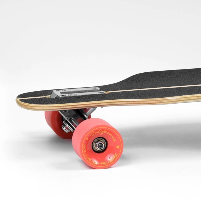 Deskorolka Longboard SMJ sport UT4209 California to sprzęt, który idealnie sprawdzi się do rekreacyjnej jazdy oraz crusingu i carvingu. Model wyposażono w długi, 8-warstowy sprężysty blat, ułatwiający uzyskiwanie dużych prędkości. Za swobodę manewrowania na zakrętach (pumping) odpowiada optymalny flex blatu. Deska posiada także traki Reverse King-Pin zamontowane w systemie Drop-thru oraz kauczukowe koła o rozmiarze 70mm/78A. Zaokrąglone krawędzie i lekko starta powierzchnia, pozwoli na łatwiejszy slide na sprzęcie.