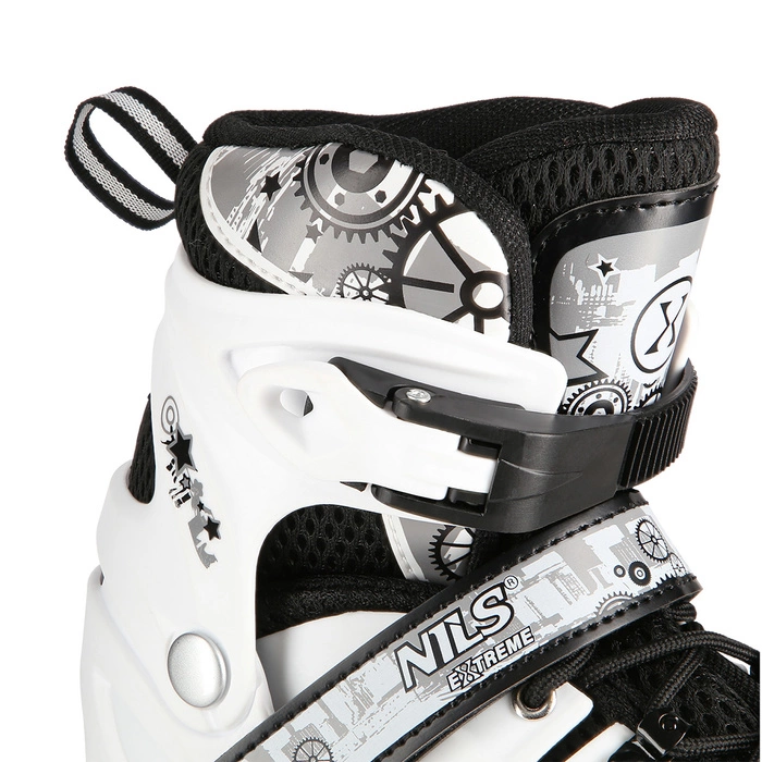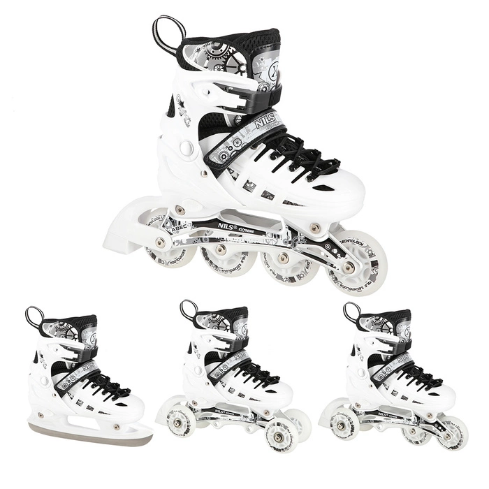 NH10905 Set Nils Extreme to łyżwy przeznaczone dla pasjonatów jazdy. Produkt oferuje 4 możliwości konfiguracji. Są to: łyżwy, łyżworolki, wrotki oraz rolko-wrotki. Rolki robią niezwykłe wrażenie, dzięki świecącym kólką. Dlaczego warto zdecydować się na wybór modelu NH10905 Nils Extreme? Ponieważ pozwala on w pełni korzystać z zalet, jakie niesie z sobą gra w hokeja oraz jazda na łyżworolkach. Łyżwy NH10905 Nils Extreme charakteryzują bardzo dobre właściwości jezdne. Jest to zasługą płóz wykonanych z wysokogatunkowej stali nierdzewnej oraz wielouchwytowego systemu zapięć, składającego się z paska na rzep, klamry i sznurowadeł, pewnie trzymającego stopy. Wszystko to sprawia, że model ten sprawdza się dobrze w każdych warunkach, dostarczając niepowtarzalnych wrażeń z treningu. To wygodne łyżwy hokejowe, zaprojektowane z myślą o początkujących i średniozaawansowanych użytkownikach. Ich wysoka jakość gwarantuje trwałość i odporność na uszkodzenia mechaniczne. Łyżworolki NH10905 to czysta radość z jazdy. Dzięki możliwości przełożenia dodatkowego kółka na tylną oś, łyżworolka funkcjonalnie zmienia się na rolko wrotkę. To rozwiązanie pomoże najmłodszym rolkarzom stawiać swoje pierwsze kroki w tym sporcie. Z kolei zamontowanie dodatkowego kółka na przednią oś sprawia, że produkt zmienia się w wrotkę. Łyżworolka wyposażona jest w specjalną aluminiową płozę oraz hamulec co zapewnia bezpieczeństwo podczas jazdy. Z kolei kółka oraz łożyska klasy ABEC7 pozwalają na mniejsze opory toczenia, czyli szybszą jazdę. Model NH10905 Nils Extreme posiada również możliwość 4-stopniowej regulacji rozmiaru buta, pozwalającą dostosować go do potrzeb użytkownika. Jest to sposób na oszczędność czasu oraz pieniędzy. Takie rozwiązanie pozwala bowiem na przedłużenie ich żywotności, daje też możliwość korzystania z nich więcej niż jednej osobie. Specyfikacja: But: twardy Wkładka: oddychająca membrana, materiał EVA, 8mm pianki o dużej gęstości Zapięcie: klamra dwusekcyjna, pasek na rzep, sznurowanie Płoza łyżwy: wysokogatunkowa stal nierdzewna Płoza łyżworolki: aluminium Kółka LED: PU 64mm/82A (S) PU 72mm/82A (M) PU 76mm/82A (L) Łożyska: ABEC 7 Przycisk do regulacji rozmiaru