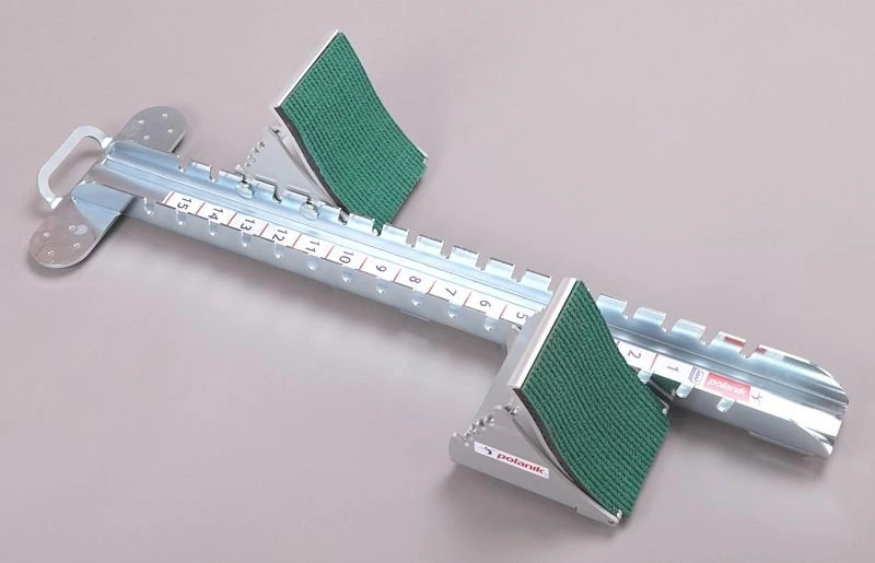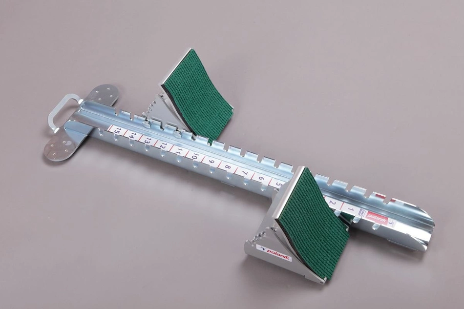 Polanik PBS17-03 to wyczynowy blok startowy dedykowany profesjonalistom przygotowującym się do oficjalnych zawodów lekkoatletycznych (posiada certyfikat IAAF nr E-17-0910). Na konstrukcję sprzętu składają się szyna wykonana z blachy cynkowanej metodą galwaniczną oraz szerokie, ergonomicznie wyprofilowane i bardzo wygodne oparcia na stopy wykonane z aluminium anodowanego na kolor srebrny. Co warte zaznaczenia, blok startowy posiada możliwość regulacji konta nachylenia oparć (dostępne jest 5 pozycji) oraz wzajemnego ich położenia względem siebie (dostępne jest 15 pozycji). Pozwala to na dostosowanie parametrów opisywanego przez nas modelu Polanik PBS17-03 pod wymagania konkretnego zawodnika. Blok startowy jest standardowo przygotowany do użytkowania na klasycznych bieżniach lekkoatletycznych tartanowych.