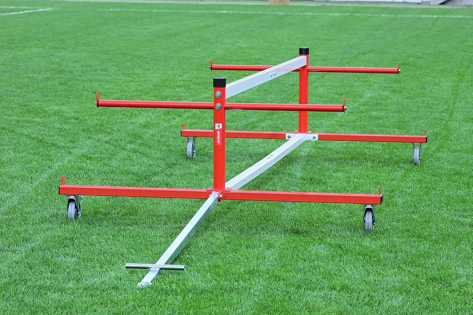 Łatwy w obsłudze, poręczny i funkcjonalny stojak wózek na tyczki z przeznaczeniem halowym. Jest wyposażony w kółka oraz uchwyt wykonany ze stali cynkowanej, co znacznie ułatwia jego przemieszczanie.