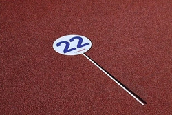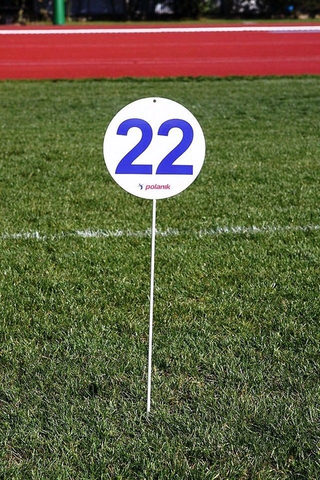 Znacznik wbijany okrągły z jedną szpilką. Wykonany ze stali lakierowanej proszkowo, cyfry po jednej stronie, przeznaczony do pchnięcia kulą.