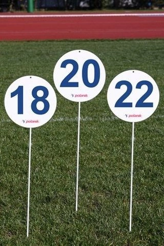 Znacznik wbijany okrągły z jedną szpilką. Wykonany ze stali lakierowanej proszkowo, cyfry po jednej stronie, przeznaczony do pchnięcia kulą.
