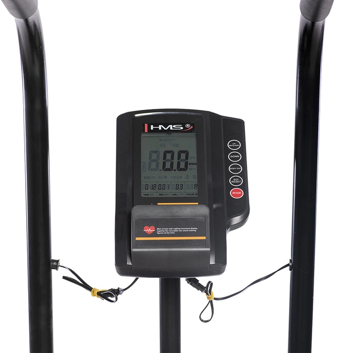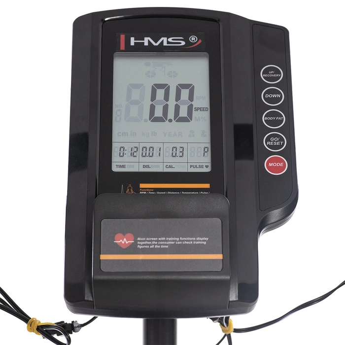Rower powietrzny HMS MP6548 posiada intuicyjny komputer z wyświetlaczem LCD, który pozwala na śledzenie wielu parametrów podczas ćwiczeń. Odczytasz na nim m.in. czas, prędkość, dystans, liczbę spalonych kalorii oraz aktualne tętno dzięki wbudowanym sensorom dotykowym w ramionach. Urządzenie umożliwia także analizę składu ciała (Body Fat), a funkcja recovery pozwala ocenić, jak szybko Twój organizm wraca do normy po zakończonym wysiłku.