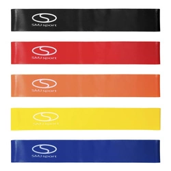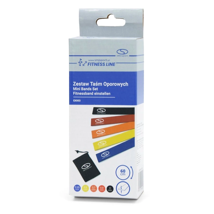 Zestaw taśm oporowych EX003, jak już wspominaliśmy, tworzy pięć taśm. Są to odpowiednio taśma niebieska o najmniejszej sile oporowania i grubości 0,35 milimetra, żółta o grubości 0,5 milimetra, pomarańczowa o grubości 0,7 milimetra, czerwona o grubości 0,9 milimetra oraz najgrubsza i najsilniej oporująca taśma czarna o grubości 1,1 milimetra. Tak duże zróżnicowanie i gradacja generowanych podczas ćwiczeń oporów tworzy ze sprzętu firmy SMJ sport produkt uniwersalny, przeznaczony dla amatorów, jak i osób o większym stażu treningowym.