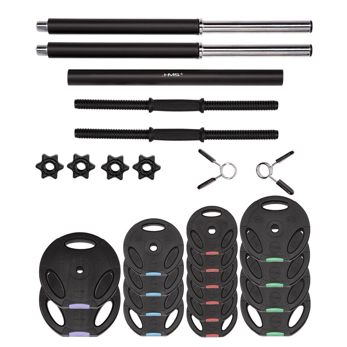 Kompletny zestaw sztang i sztangielek kompozytowych w kolorze czarnym HMS SGSP60 SET 62 KG to doskonałe rozwiązanie dla osób, które chcą rozpocząć lub rozwinąć trening siłowy w warunkach domowych. W skład zestawu wchodzą trzy wytrzymałe gryfy – dwa krótkie o długości 45 cm oraz jeden długi o długości 145 cm, co pozwala na wykonywanie zarówno ćwiczeń na górne partie ciała, jak i treningu całego ciała. Zastosowanie kompozytu oraz wypełnienia cementowego sprawia, że sprzęt jest odporny na uszkodzenia i zachowuje swój kształt nawet przy intensywnym użytkowaniu. Przykładowo, możesz wykorzystać krótkie gryfy do ćwiczeń bicepsów i tricepsów, a długi gryf do przysiadów czy wyciskania leżąc.