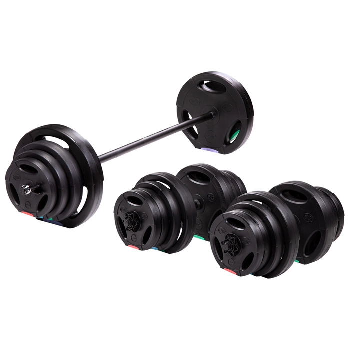Elementy zestawu zostały wykonane z wytrzymałego tworzywa PE i wypełnione cementem, co zapewnia odporność na uderzenia, pęknięcia oraz codzienne zużycie. Każdy talerz posiada wewnętrzną średnicę 25,4 mm, co umożliwia łatwą rozbudowę o dodatkowe obciążenia w przyszłości. Dodatkowo w zestawie znajdują się cztery zaciski gwiazdkowe i dwa motylkowe, które gwarantują szybkie i bezpieczne zamocowanie talerzy na gryfach. Dzięki temu możesz w pełni skoncentrować się na treningu, mając pewność, że sprzęt jest stabilny i nie ulegnie przypadkowemu poluzowaniu. Podczas ćwiczeń takich jak martwy ciąg czy wyciskanie na ławce, solidne mocowanie zapewnia komfort i bezpieczeństwo użytkowania.