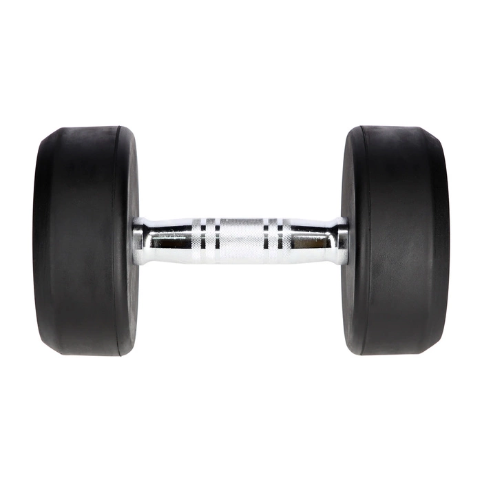 Uchwyt hantli został zaprojektowany z myślą o maksymalnym komforcie użytkowania. Radełkowana powierzchnia zapewnia stabilny i bezpieczny chwyt nawet podczas intensywnych ćwiczeń, minimalizując ryzyko wyślizgnięcia się sprzętu z dłoni. To szczególnie ważne podczas dynamicznych serii, kiedy dłonie mogą być spocone. Przykładowo, podczas wykonywania przysiadów z hantlami lub wyciskania nad głowę, pewny uchwyt przekłada się na większą kontrolę nad ruchem oraz bezpieczeństwo użytkownika.