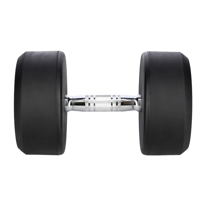 Jedną z kluczowych cech tej hantli jest ergonomiczny uchwyt o średnicy 32 mm oraz długości 14,8 cm, wyposażony w specjalną radełkowaną powierzchnię. Takie rozwiązanie zapewnia pewny chwyt nawet podczas bardzo wymagających serii treningowych, co minimalizuje ryzyko wyślizgnięcia się hantli z dłoni. Przykładowo, podczas wykonywania ćwiczeń takich jak martwy ciąg jednorącz czy wyciskanie na barki, użytkownik może skoncentrować się na technice, nie obawiając się o stabilność uchwytu – nawet przy spoconych dłoniach.