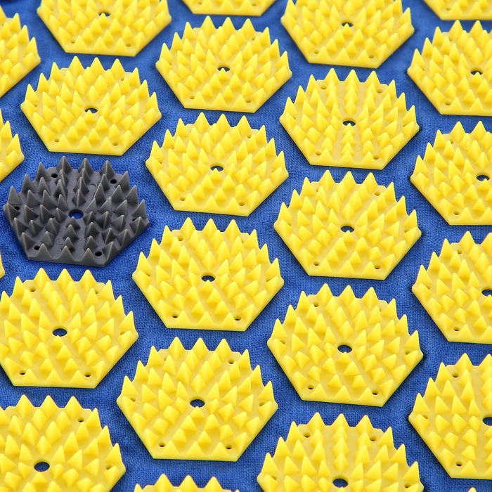 Mata AKM01 PINK SET wyposażona jest w 231 rozet z wytrzymałego tworzywa ABS, z których każda posiada 48 specjalnie zaprojektowanych kolców. Łącznie daje to aż 11 088 punktów masujących, które skutecznie pobudzają krążenie krwi i wspierają regenerację mięśni po wysiłku. Zastosowane materiały są całkowicie bezpieczne i nie powodują podrażnień, dlatego produkt jest odpowiedni także dla osób z delikatną skórą. Przykładowo, po intensywnym treningu wystarczy położyć się na macie, aby poczuć ulgę w zmęczonych mięśniach, natomiast podczas pracy zdalnej można oprzeć stopy na poduszce, stymulując receptory i poprawiając samopoczucie bez wstawania od biurka.
